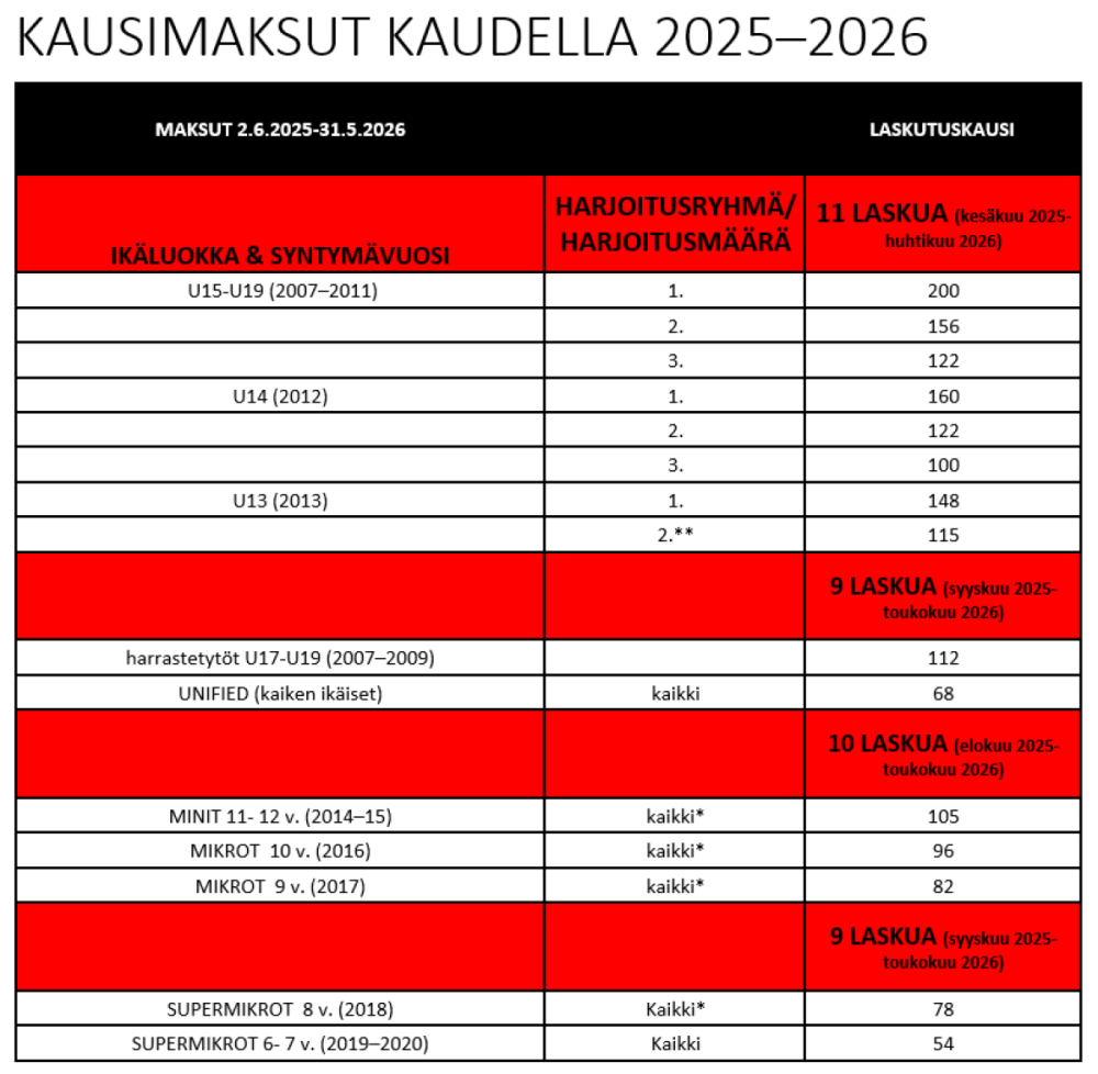 • Mikäli pelaaja U13-U19 (2007–2013) ikäluokissa harjoittelee 1. ryhmässä, tulee pelaajan maksaa 1. harjoitusryhmän mukainen kausimaksu.
